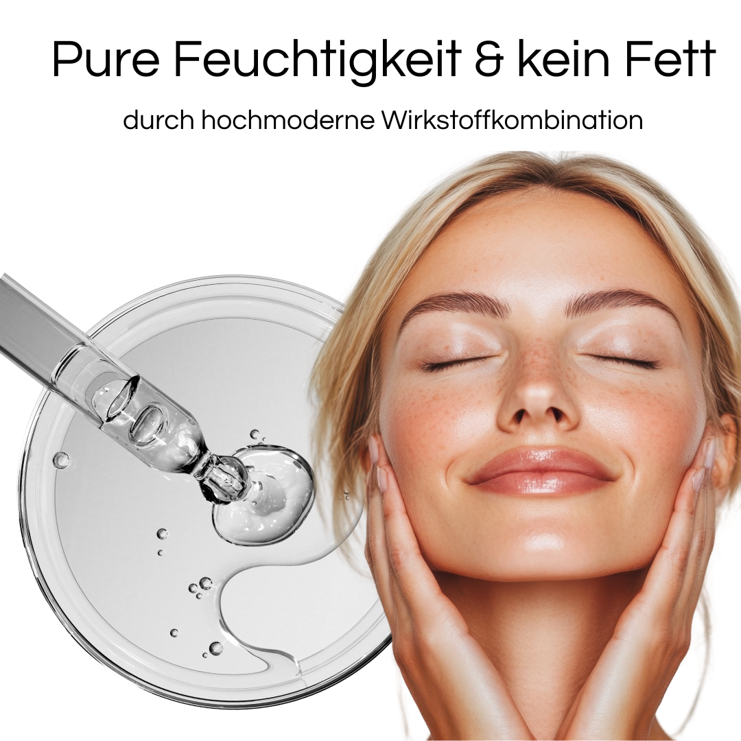 Unser fortschrittliches Hyaluron-Booster nutzt nicht nur die feuchtigkeitsspendenden Eigenschaften gewöhnlicher Hyaluronsäure, sondern umfasst auch eine wirksame Mischung aus verschiedenen Hyaluronsäuren! In unserem Konzentrat ist eine Kombination aus reiner hoch- und niedermolekularer Hyaluronsäure in einer außergewöhnlich hohen Konzentration enthalten, wodurch es feuchtigkeitsbindend und leicht hautstraffend in verschiedenen Hautschichten wirken kann. Langkettige Hyaluronsäure kann das in der obersten Hautschicht enthaltene Wasser binden, wodurch ein sichtbarer aufpolsternder Effekt auf der Haut entsteht. Die kurzkettige Hyaluronsäure dringt in die oberste Hautschicht ein und kann die innere Feuchtigkeitsbalance auf lange Sicht beeinflussen. Durch die Anregung der Produktion von Kollagen und Elastin kann das Hyaluron-Booster die Hautregeneration steigern – was einen hervorragenden Anti-Aging-Effekt zur Folge hat. Fältchen werden durch dieses Hyaluronserum bei täglicher Anwendung nachweislich reduziert, und es sorgt für einen feuchtigkeitsfördernden Langzeiteffekt.